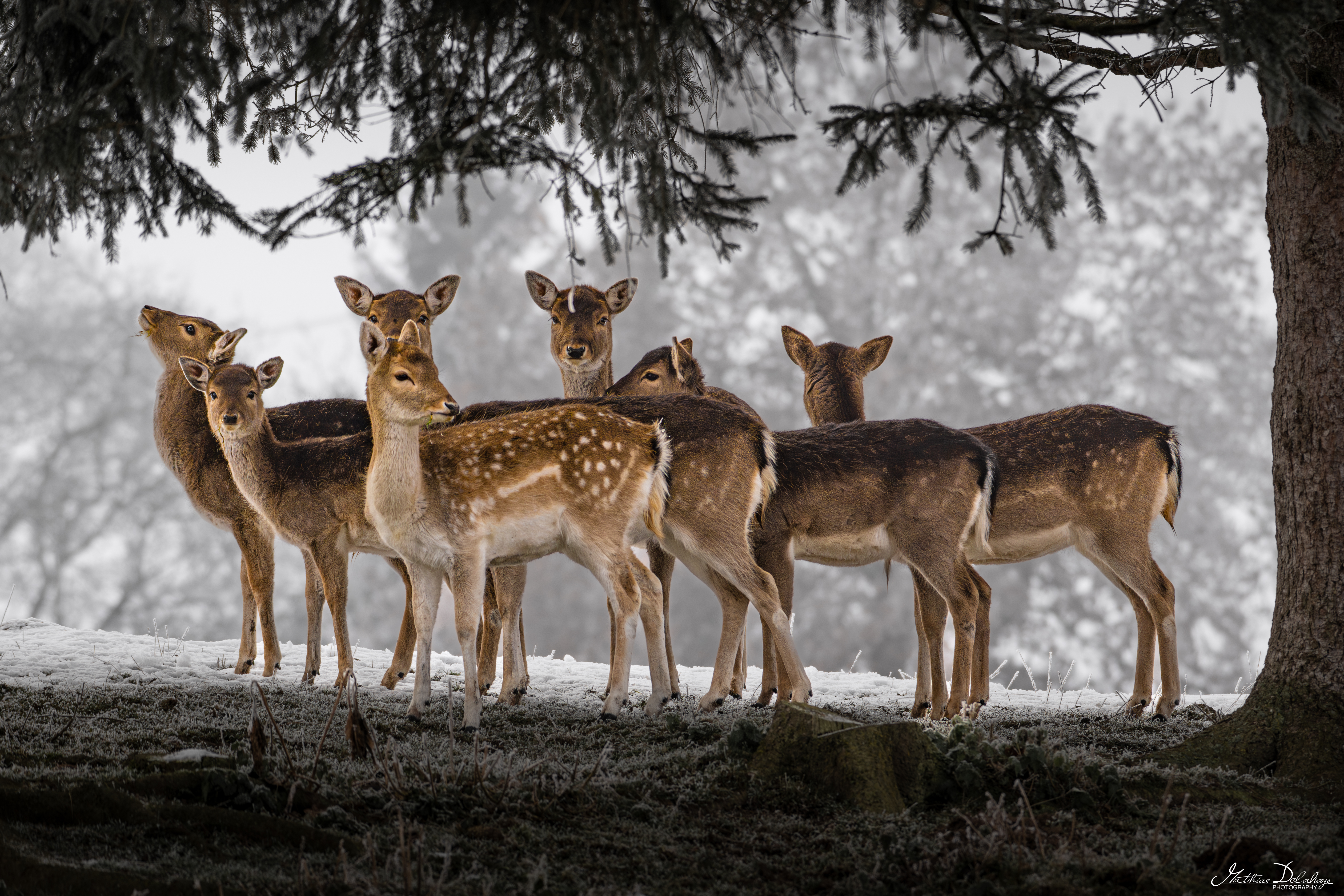 In a quiet winter landscape, several deer gather around a lone tree, their forms contrasting against the snowy surroundings