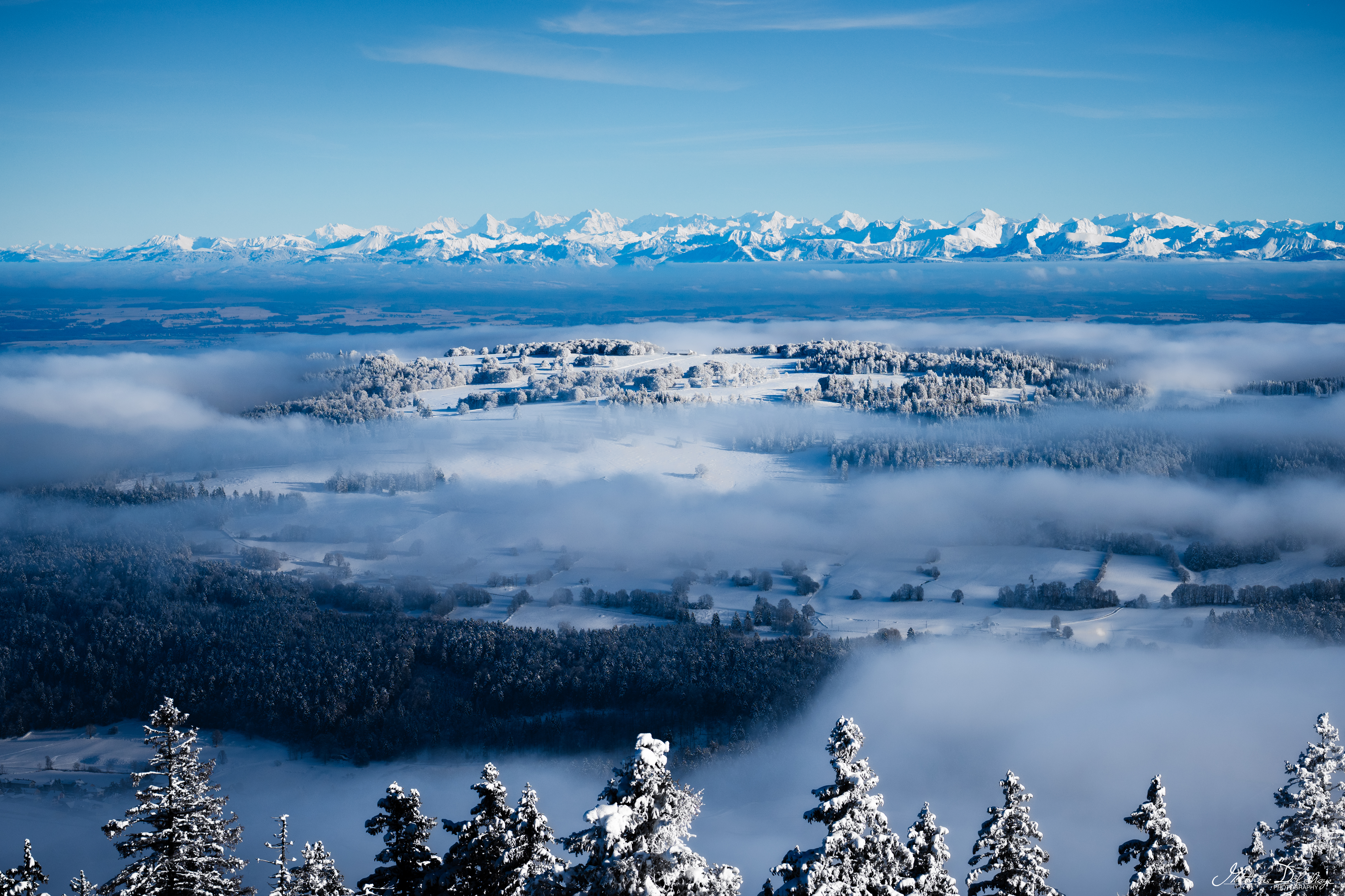 From the summit of Dent de Vaulion, a winter day reveals Romandie blanketed in snow, with clouds drifting across the landscape, highlighting valleys and peaks