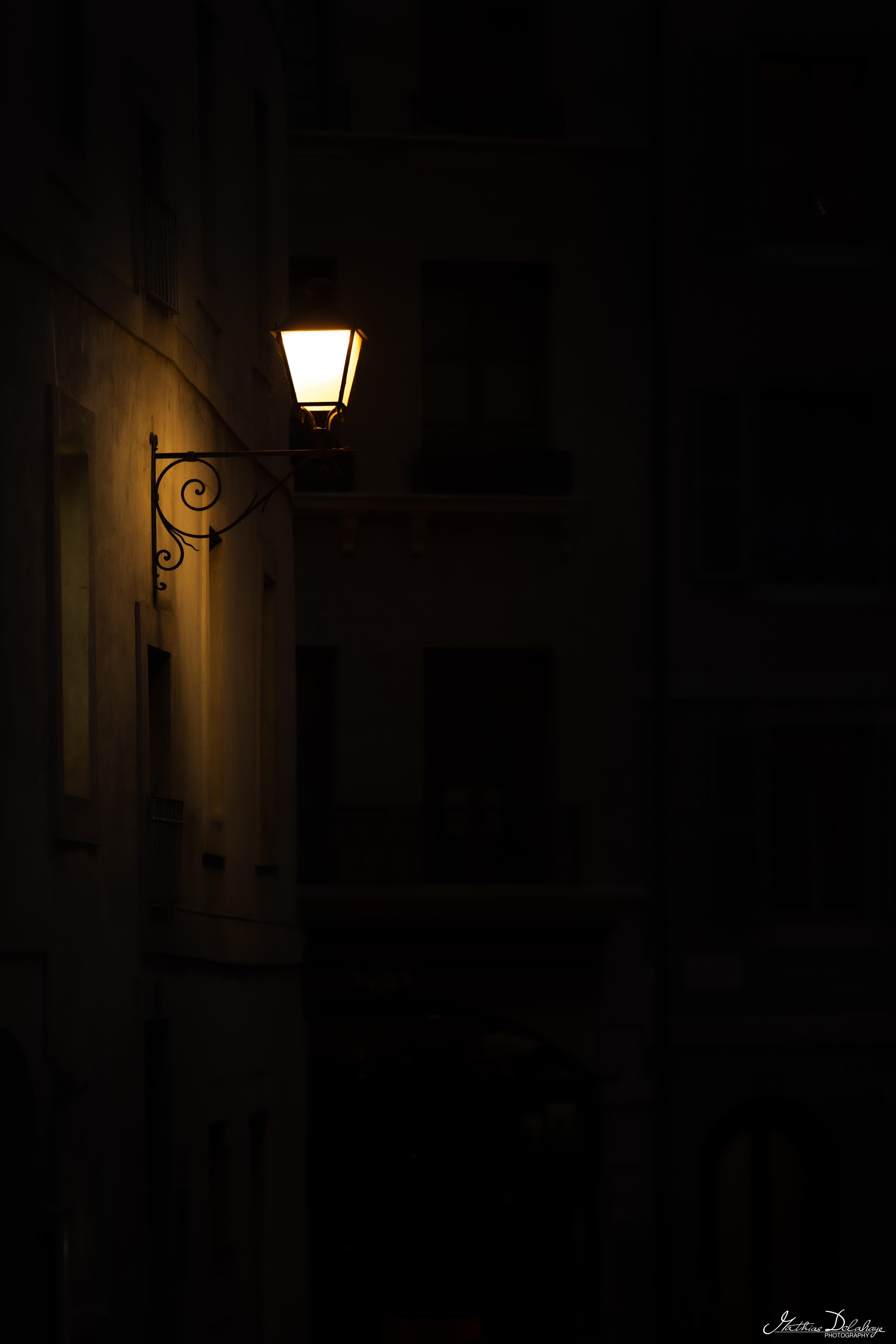 A warm street lamp illuminates one of the charming streets in Geneva's Old Town, casting a soft glow on the historic buildings in the dark of night