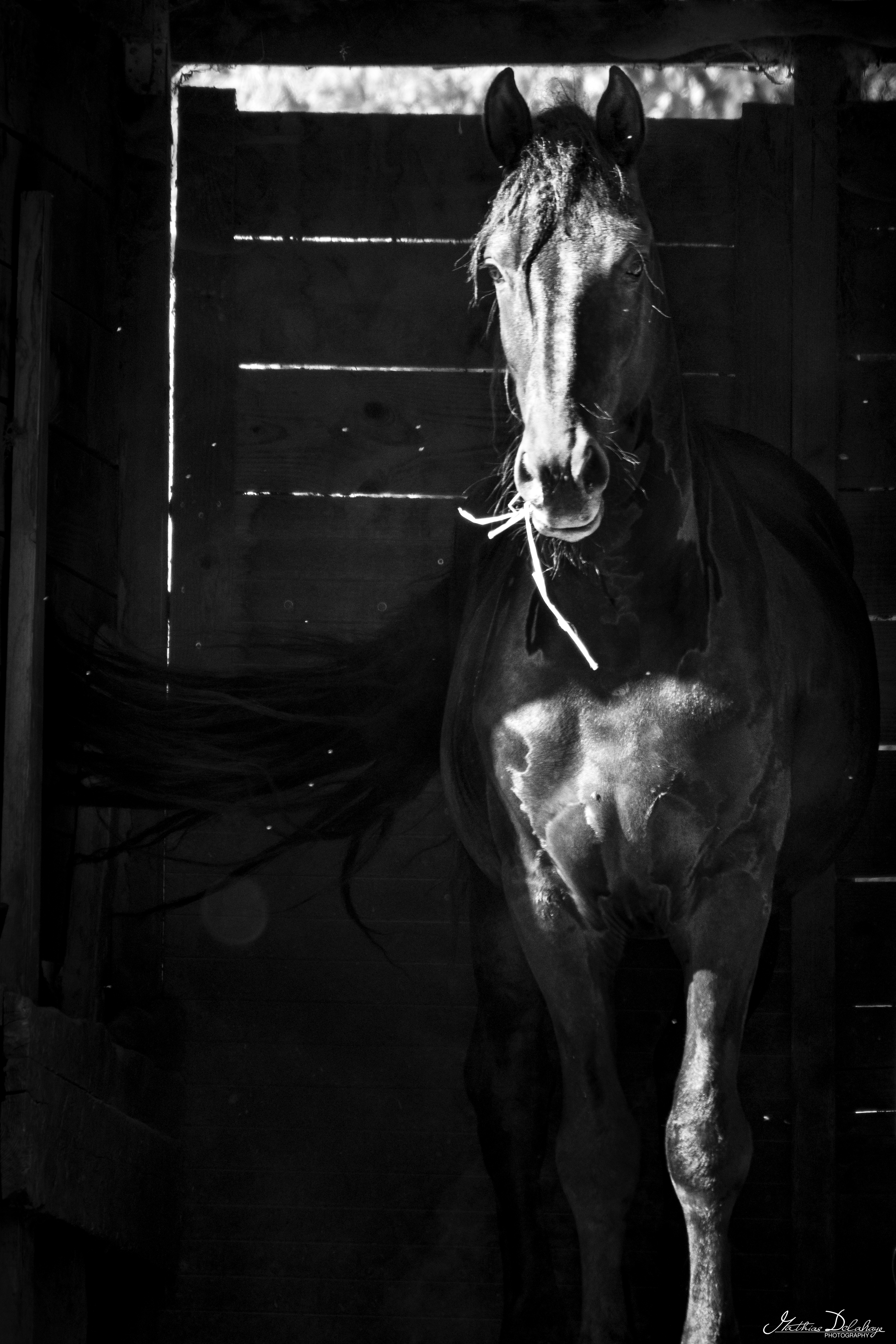 In a wooden barn, a horse moves gracefully with its tail swishing, captured in dramatic black-and-white vertical composition. Dust particles catch the light, adding texture and atmosphere.