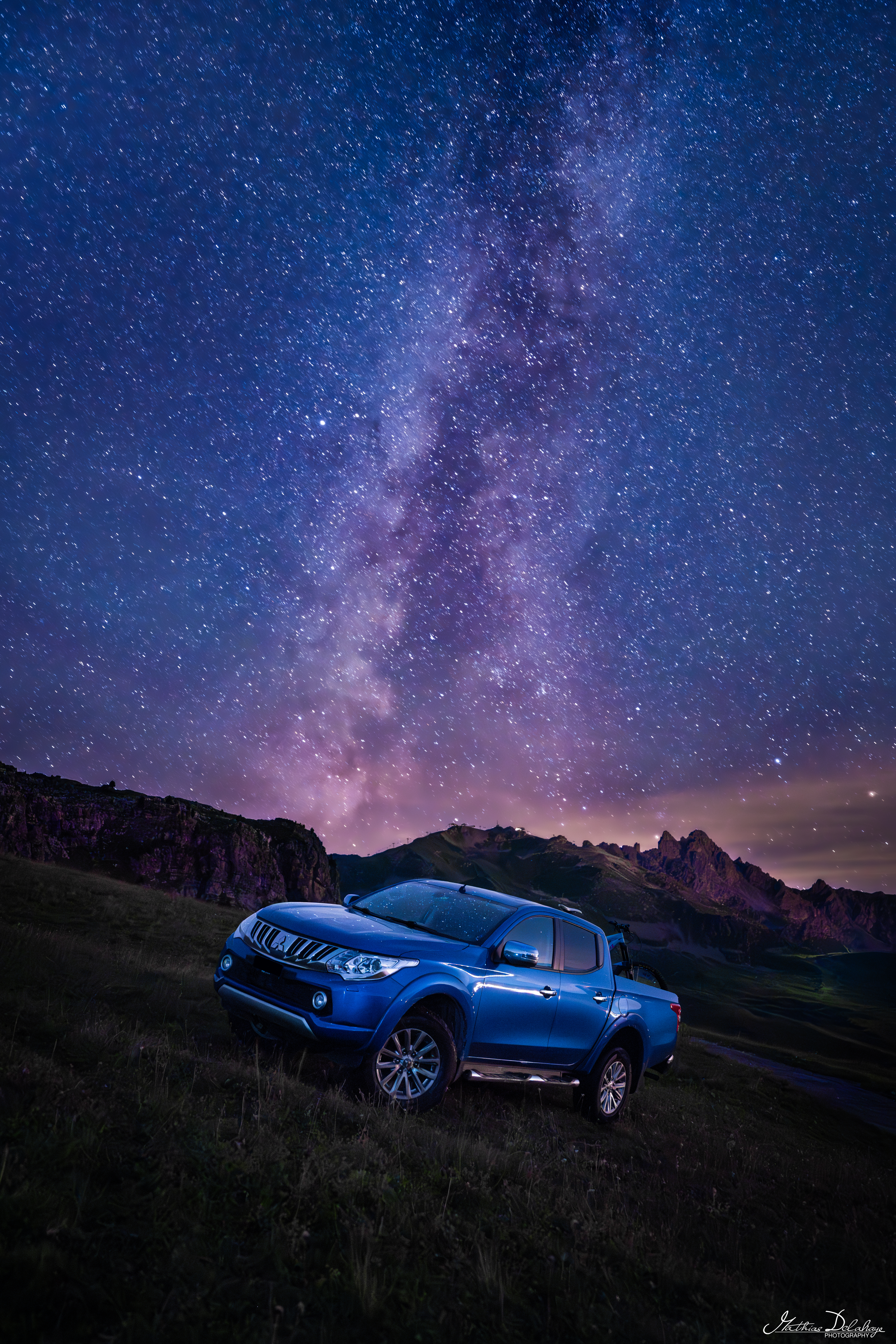 The L200 stands on the mountain beneath the star-filled Milky Way, blending off-road adventure with the beauty of the night sky