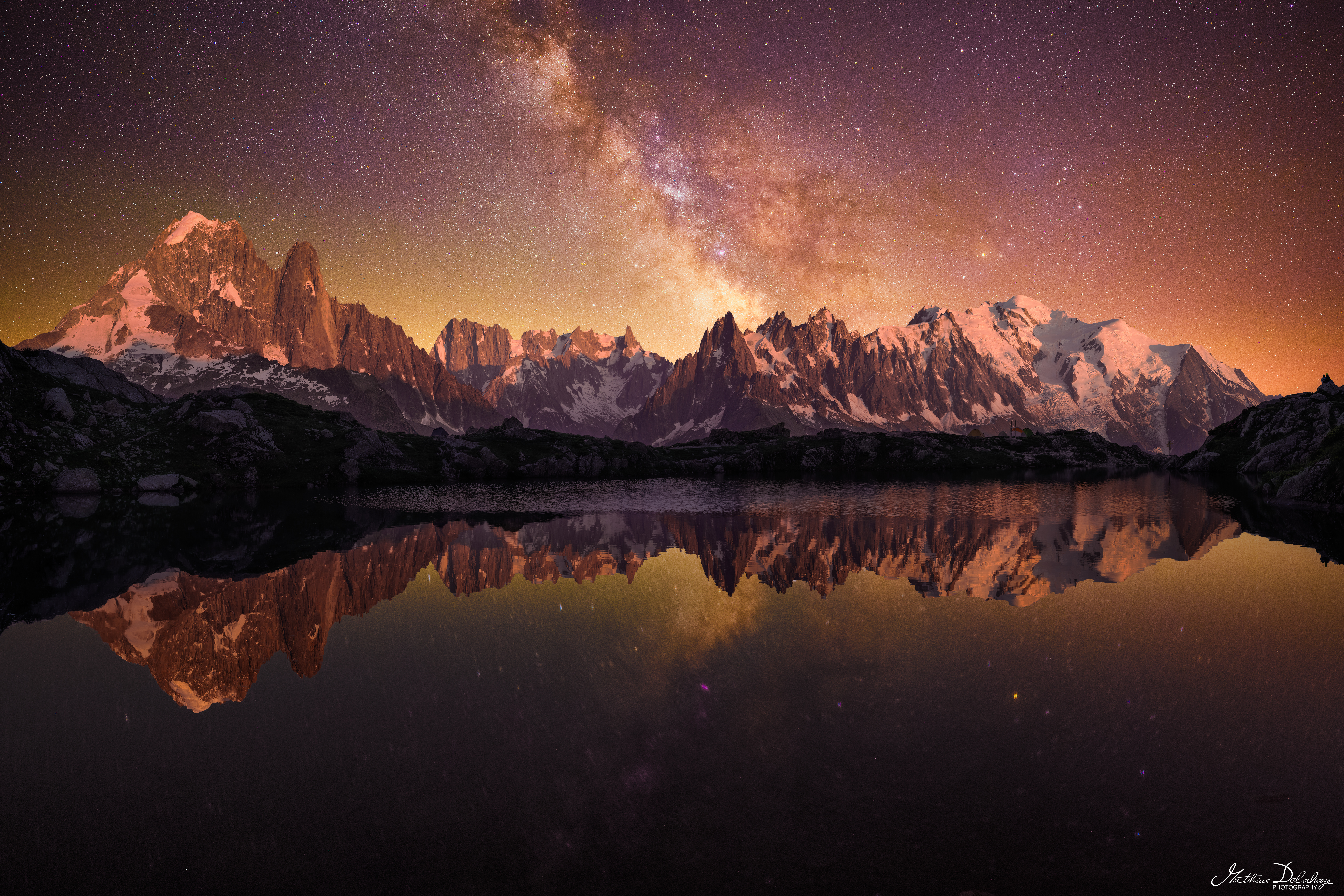 A couple of weeks before taking this photo, I purchased a SkyWatcher Star Adventurer 2i and started scouting locations for astrophotography. My first attempt didn't go as planned: I drove out to find a clear sky, only to realize that I had forgotten the power cable for the equatorial mount. Determined, I kept searching for the right locations and waited for perfect conditions to align. Arriving in Chamonix in the afternoon, we were sadly misinformed about lift closing times, which cost us extra time purchasing food. Despite buying tickets for both lift sections, only one was operating. As a result, my brother and I had to hike from the mid-station up to Lac Blanc and then descend to Lac des Chéserys (carrying all my astrophotography gear). Once on site, I discovered that camping now required authorization. Undeterred, I decided to go ahead with the session. Without food, a tent, or a sleeping bag, I spent the night in my usual shorts, waiting for the Milky Way to rise and capture its reflection on the lake. In the morning, we hiked back to the lift. Once home, I finally stacked the images to create this final shot. This photo was taken with my Nikon Z7 II, combining a 105mm f/5.6 foreground exposure with ten 30-second shots of the Milky Way.