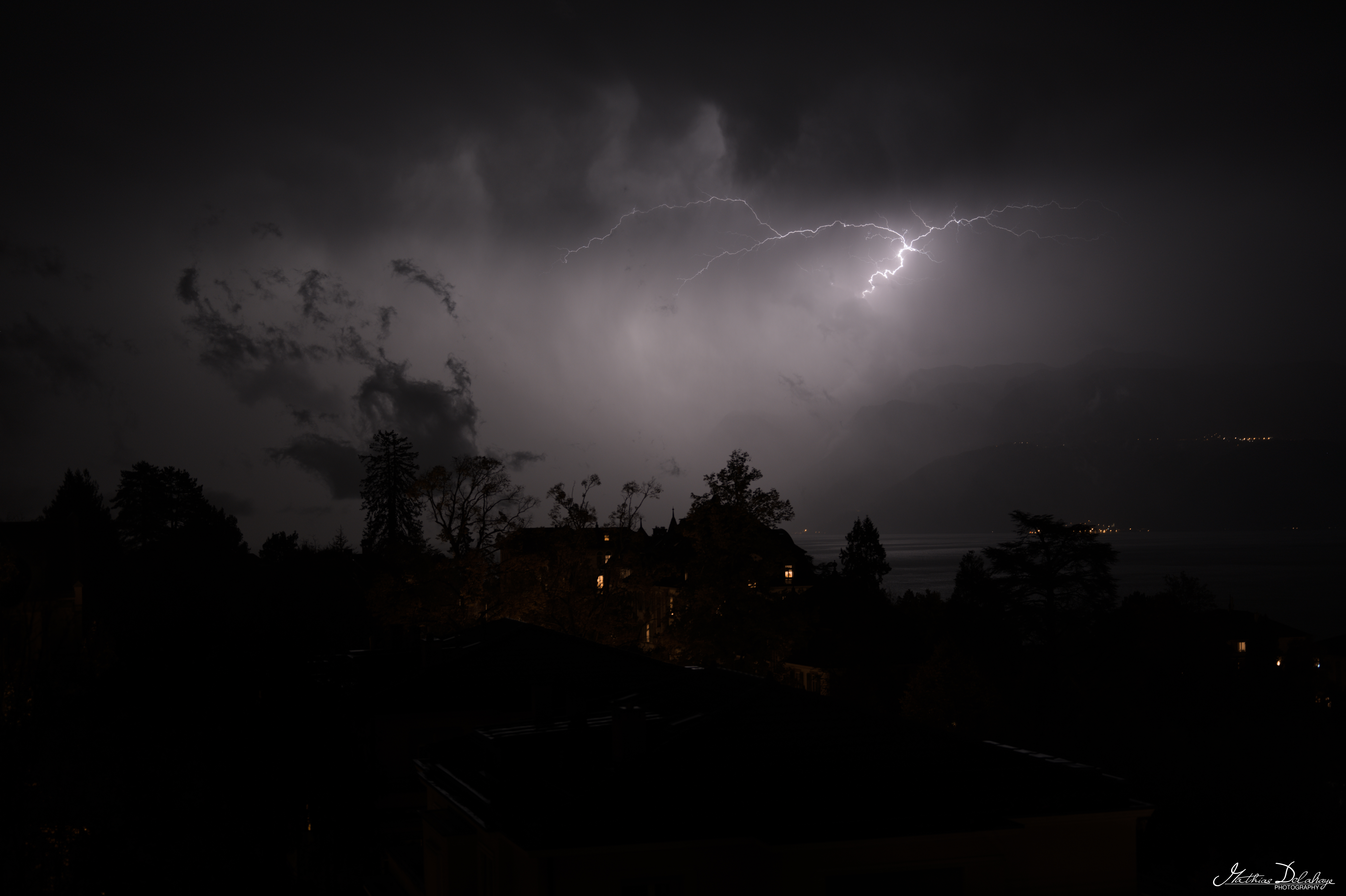 Over Lake Léman, a lightning bolt illuminates the night sky in the shape of a dragon, with a cloud drifting below in the form of a boat