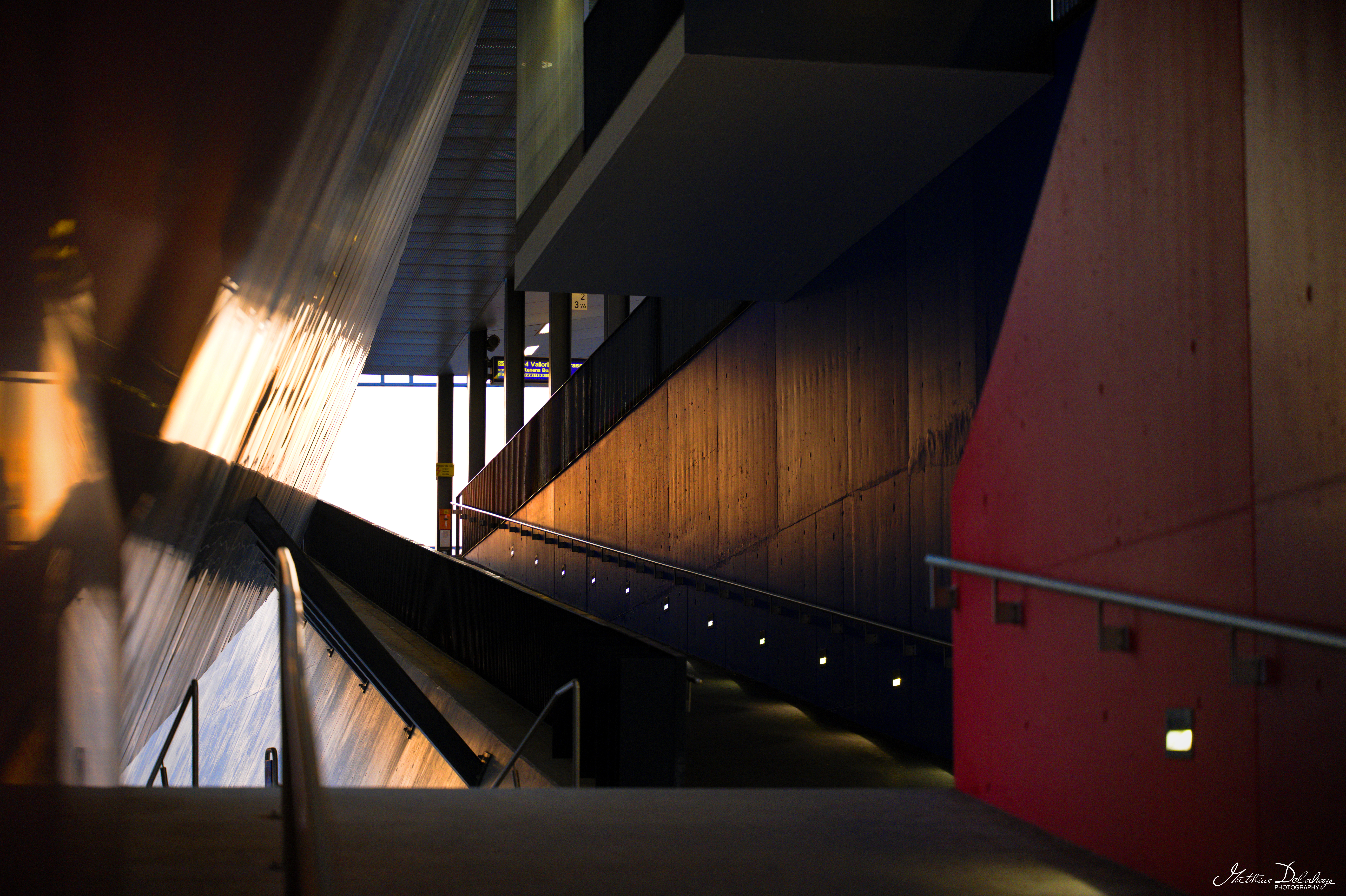 The contemporary architecture of Prilly-Malley's train station glows under the warm tones of sunset, blending modern design with soft evening light