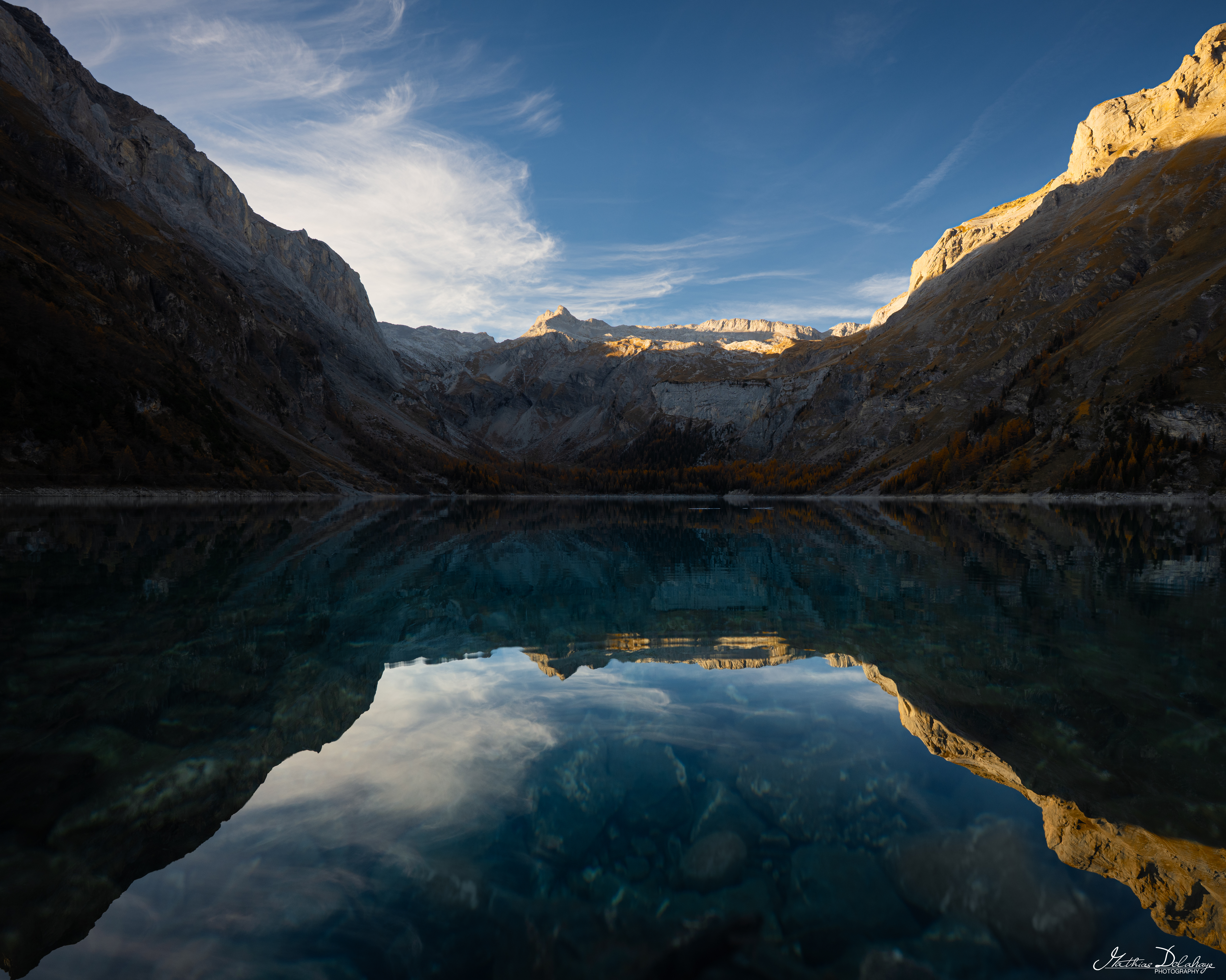 Tseuzier Lake mirrors the towering peaks and sky above, capturing a tranquil alpine scene with crystal-clear reflections